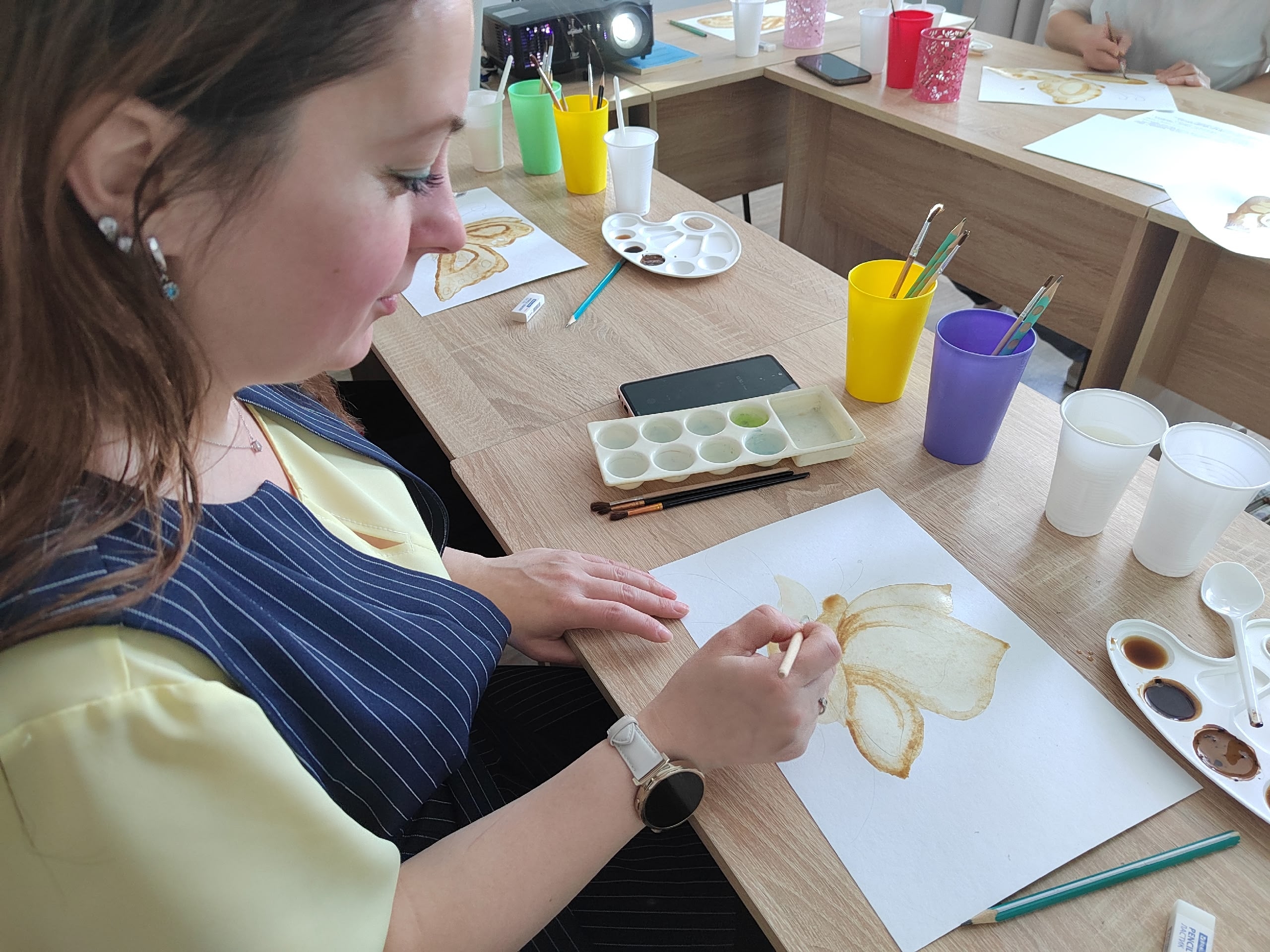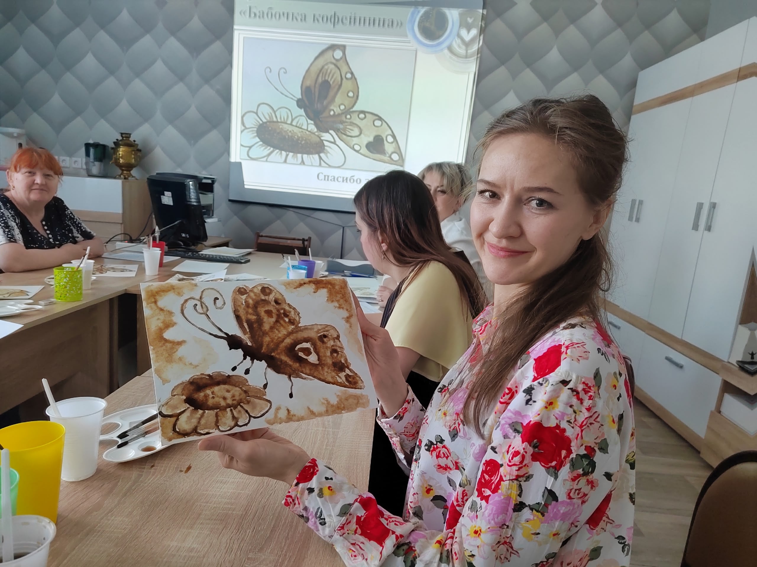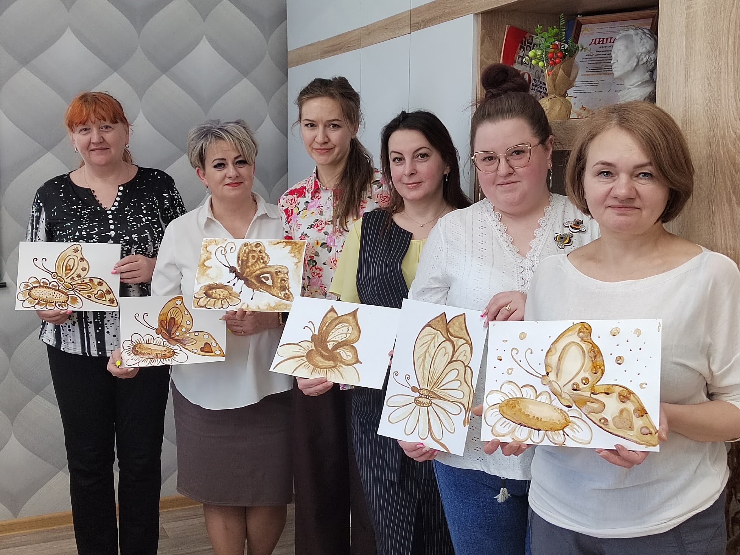 27 марта состоялась третья встреча с участниками городского методического объединения. На творческой встрече, Кочманюк Н.В., воспитатель МБДОУ "Детский сад № 42" провела мастер-класс по нетрадиционной технике рисования "Кофеграфия" (кофейная живопись). Наталья Владимировна познакомила нас с секретами данной техники. Это новое направление в арт-терапии, в котором в качестве красок используется кофе. Большим преимуществом этого материала является его необычайная пластичность, при необходимости его можно легко вымыть водой. Это позволяет корректировать рисунок и достигать самой лучшей передачи оттенков: от нежно-кремового до темно-каштанового. Во время мастер-класса аромат кофе создал уютную атмосферу, пробудил фантазию и вдохновил всех на приятные образы парящих бабочек. Хочется отметить, что данный вид творчества имеет и медитативный процесс рисования, во время которого погружаешься во внутренний мир, отвлекаешься от повседневных проблем и раскрываешь свои новые грани творческих способностей.