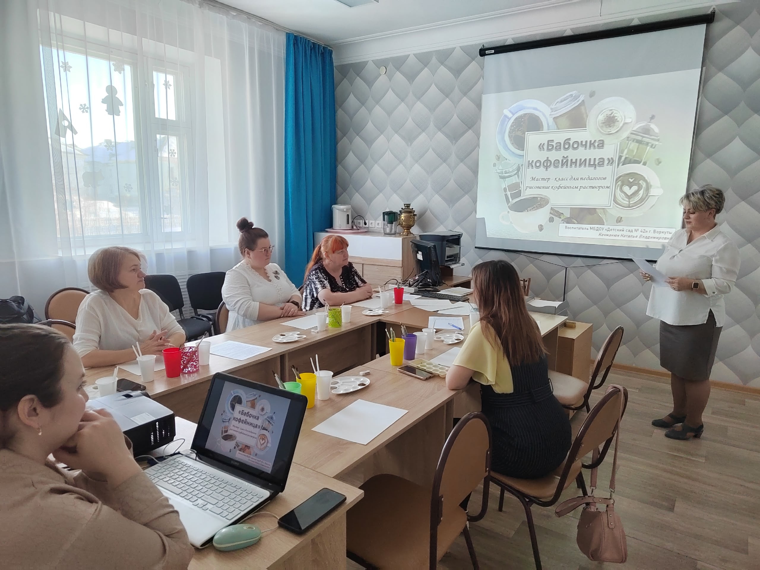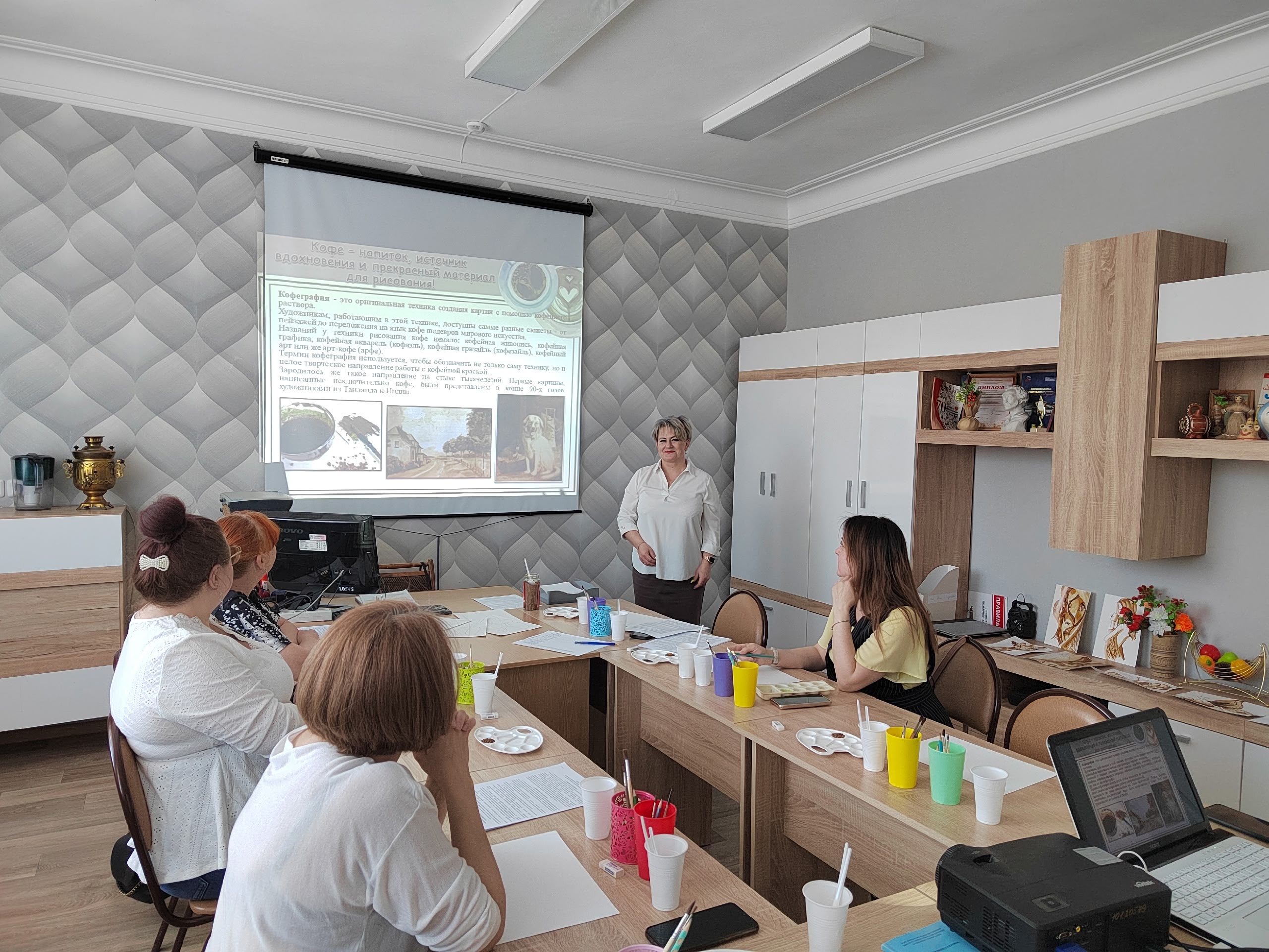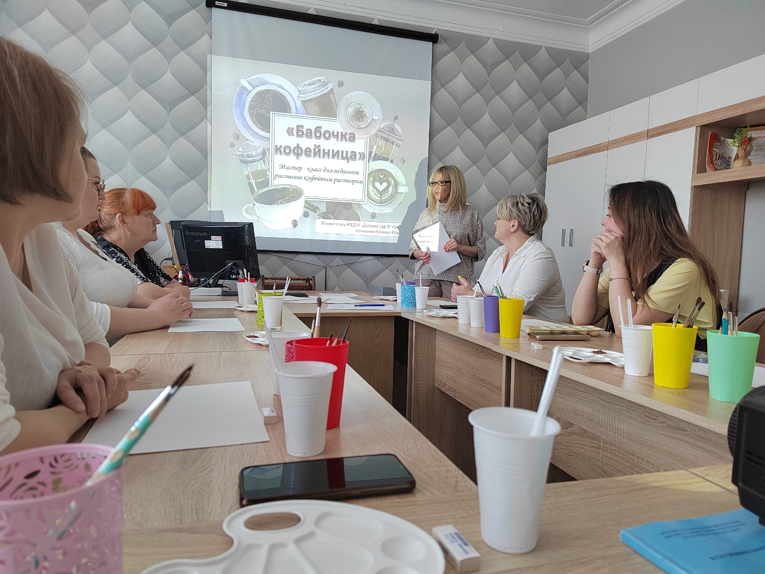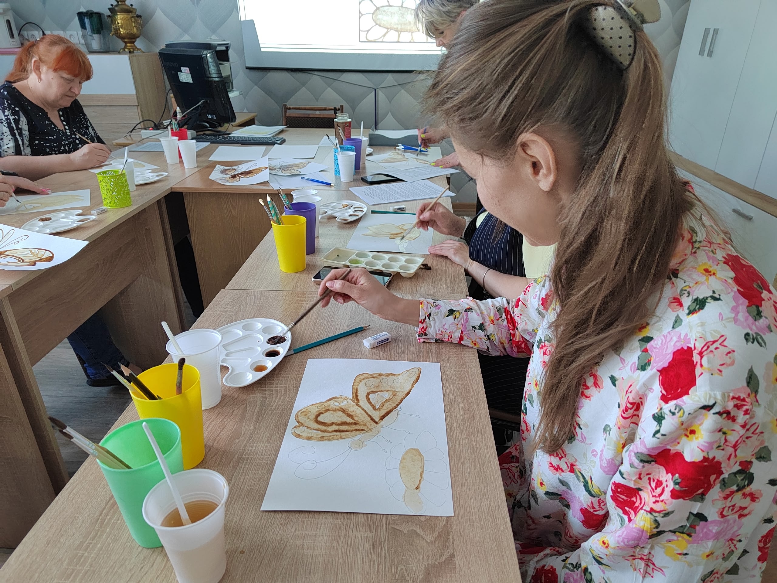 27 марта состоялась третья встреча с участниками городского методического объединения. На творческой встрече, Кочманюк Н.В., воспитатель МБДОУ "Детский сад № 42" провела мастер-класс по нетрадиционной технике рисования "Кофеграфия" (кофейная живопись). Наталья Владимировна познакомила нас с секретами данной техники. Это новое направление в арт-терапии, в котором в качестве красок используется кофе. Большим преимуществом этого материала является его необычайная пластичность, при необходимости его можно легко вымыть водой. Это позволяет корректировать рисунок и достигать самой лучшей передачи оттенков: от нежно-кремового до темно-каштанового. Во время мастер-класса аромат кофе создал уютную атмосферу, пробудил фантазию и вдохновил всех на приятные образы парящих бабочек. Хочется отметить, что данный вид творчества имеет и медитативный процесс рисования, во время которого погружаешься во внутренний мир, отвлекаешься от повседневных проблем и раскрываешь свои новые грани творческих способностей.